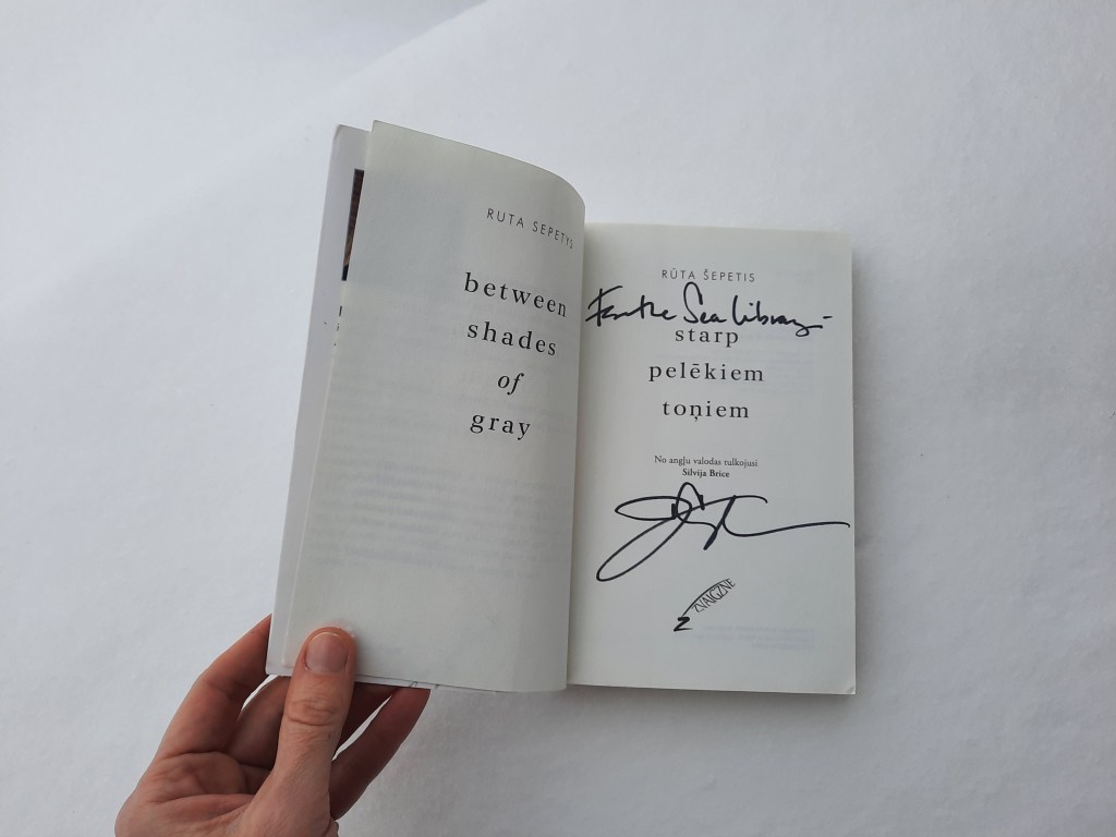 Rūta Šepetis “Starp pelēkiem toņiem”. Oriģinālā izdota 2011. gadā. No angļu valodas tulkojusi Silvija Brice. Latviski publicēta izdevniecībā “Zvaigzne” 2011. gadā. Dāvana bibliotēkai no Rūtas Šepetis Mičiganā, ASV ❤️