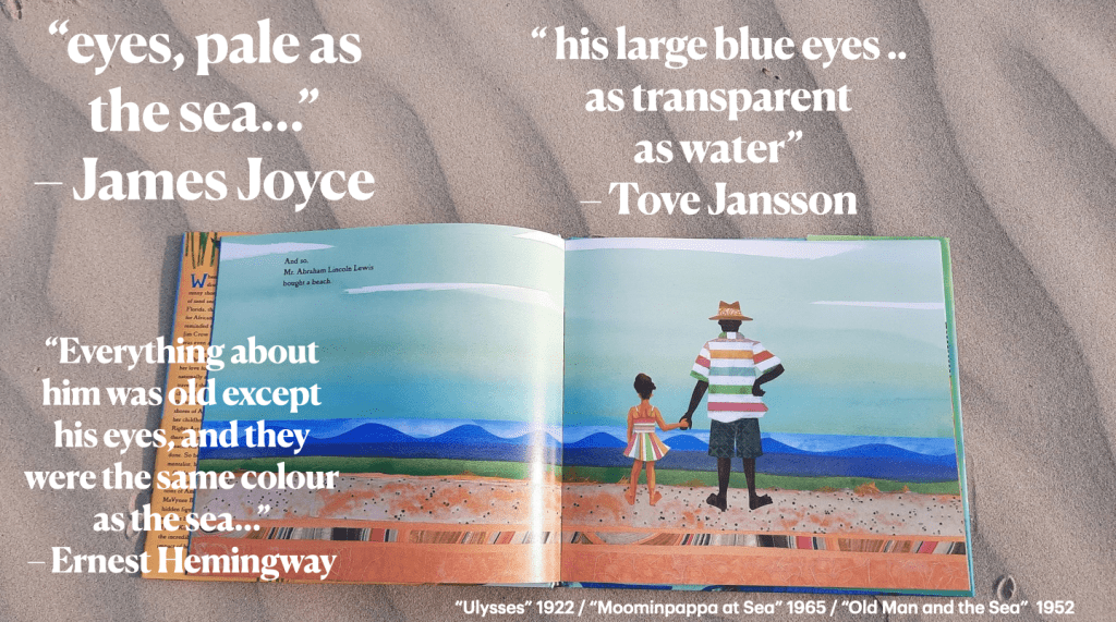 I’ve noticed in many books the eyes of those who are looking out to sea. Those eyes often are in the colour of the sea itself. Has sea affected them? Do we become changed by the sea? I love to imagine a long and timeless beach where all the sea lovers from books and stories stand and gaze at the horizon. Here’s young Stephen from James Joyce’s “Ulysses” crashing with his boots “crackling wrack and shells”. There’s Moomin family collecting white shells for mum’s garden, and there’s Hemingway’s old man Santiago pushing his boat into the dawn. It’s forbidden to look straight at the sun. It’s said you can become mad by looking at a full moon for too long. But what about the sea? What happens if we are looking at it too often?