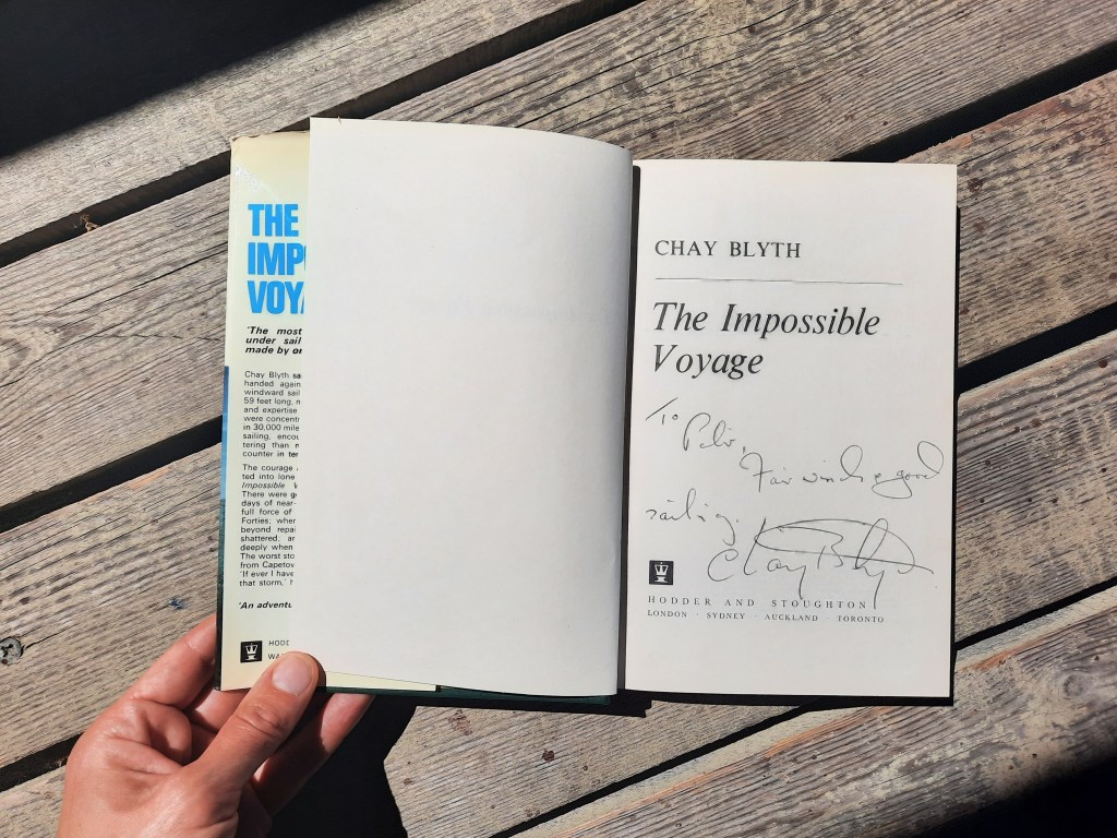 Chay Blyth “The Impossible Voyage”. Published in 1971 by Hodder and Stoughton. This signed first edition was donated to the library by Malcolm Carey from Cornwall, UK ❤️