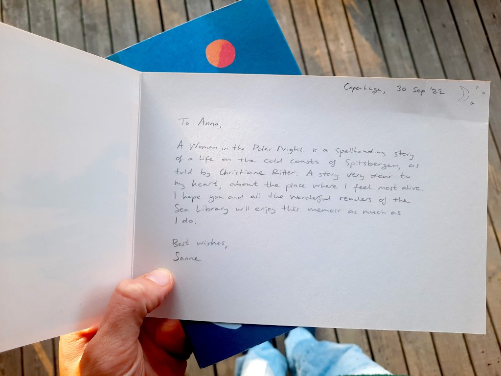 Christiane Ritter “A Woman in the Polar Night: The classic memoir of a year in the Arctic wilderness”. First published in English in 1954. Translated by Jane Degras. This edition was published by Pushkin Press in 2019. Donated to the library by Sanne Moedt from Denmark. “I would like to donate my favourite Arctic memoir to the Sea Library,” she writes in an e-mail in September. Sanne also says: “Your posts inspire me to read more, to swim more, and to just look at the sea more.” ❤️