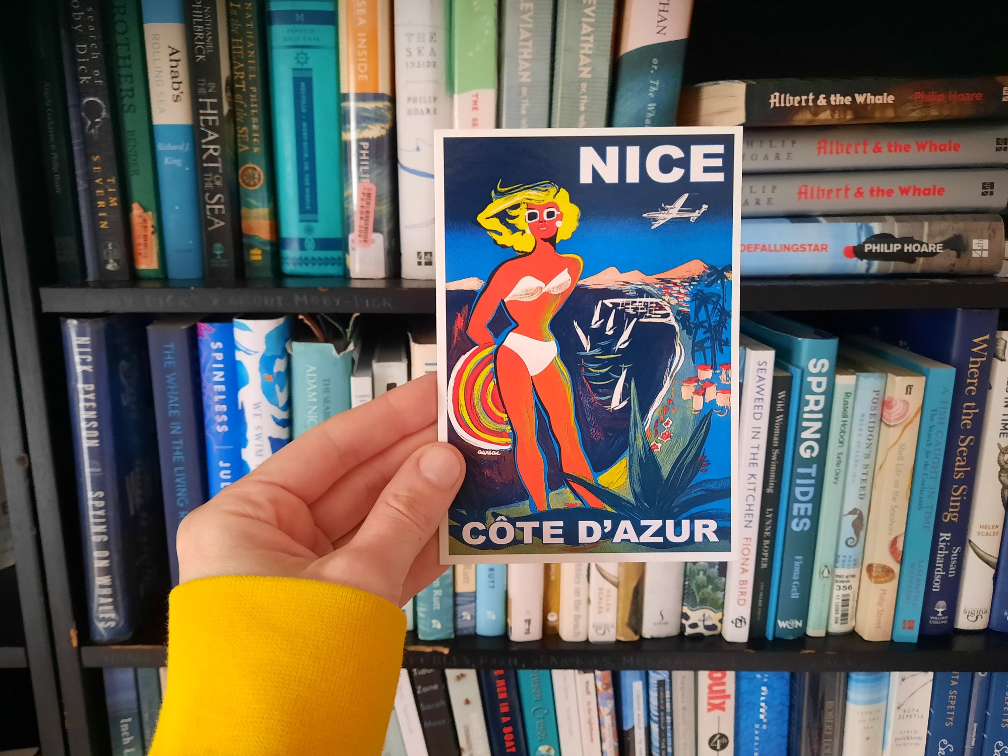There won’t be any chronological order. So I’ll just start with this: a postcard from Marta and Margarita, mother and daughter, my best friend for life and my goddaughter. They visited French Riviera in April 2023 and brought some gifts for the Sea Library, including this colorful postcard from Nice Côte d’Azur.