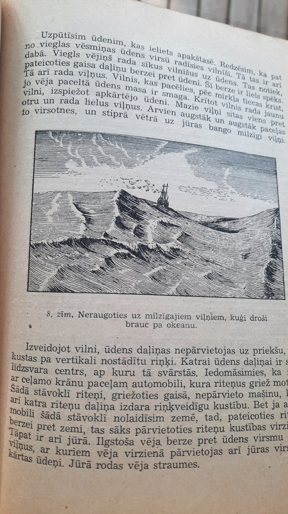 Morāli novecojusi, bet vizuāli skaista 40 lappušu grāmatiņa, kurā koncentrētā veidā stāstīts par pasaules jūrām un okeāniem nodaļās “Vai daudz ir ūdens uz Zemes?”, “Okeana dziļums un tā dibens”, “Jūras ledus”, “Straumes”, “Gaisma jūrā” u.c.