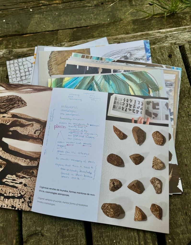 This billingual publication in Portugese and English of 60 free-from-order pages in a black box by Brazilian artist Renata Pelegrini was designed in 2022 and its title “TENTACULAR” was borrowed to name the artist’s solo show in Casa do Olhar Luiz Sacilott in São Paulo, Brazil, from May to July in 2023. Repetition of the squared pages have been inspired by the Fibonacci sequence (in which each number is the sum of the two preceding ones) noticed in shell pieces found on sand. Paintings, drawings, weavings, sculptures, sketches, notes and found objects all mixed in a fluid flow of questions and search. Fascination with orchid roots and their wisdom, with gestures and movement, playing with lamp light and shadows and letting go of the dominion of the known. “Her gaze traverses light and dark and creates things – such as tray of bones or a table – on which reinvented memories of the arc of existence itself are deposited,” writes psychoanalyst, author and art critic Bianca Coutinho Dias in an introduction essay. “They are arteries or corals, transmutations, old knitting needles, brushes, trunks of plants, all in a coexistence that combines inside and outside, natural and instinctual bodies, poetry and science.”