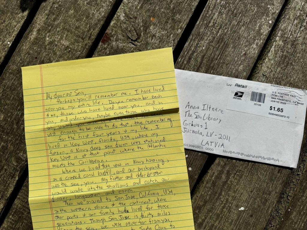 This May, I sent out a call to sea communities around the world: Write a Letter to the Sea. The 6th letter has arrived on June 30, 2025, from Lewis Buzbee in San Francisco, California, USA. Lewis is a very good friend of mine. We’ve never met (yet), but we’ve exchanged letters for nearly ten years and have even written a manuscript together (about sea, books, boats and friendships) that will hopefully find a publisher soon. His latest book Diver can be borrowed from the Sea Library and I enjoyed talking to Lewis about it. I’m so happy he supported this initiative and wrote his own letter to the sea.