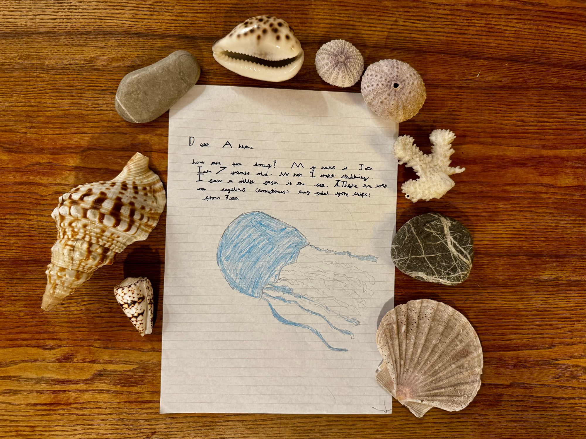 Kā tev klājas? Mani sauc Jeta, man ir 7 gadi. Kad es gāju ķert krabjus, es jūrā redzēju medūzu. Dažreiz ir daudz kaiju, kas zog tavus čipsus!