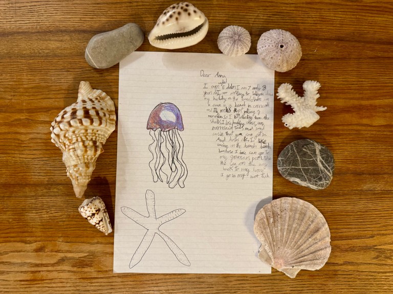 Mani sauc Edena. Man ir 7 gadi, drīz būs 8. Es rakstu, lai pastāstītu Tev par savām brīvdienām pludmalē. Kornvolā pludmalē bija ala, un no kalna visu laiku krita mazi akmentiņi. Tāpēc es vācu gliemežvākus. Man patīk būvēt krēslus, kūkas, nāru astes un smilšu pilis, kurās var ieiet. Un arī caurumus u.c. lietas. Man patīk dzīvot pie jūras, jo, ejot mājās, es varu ieiet jūrā un manas vecmāmiņas baseinā, un, atgriežoties mājās, es eju savā karstajā vannā.