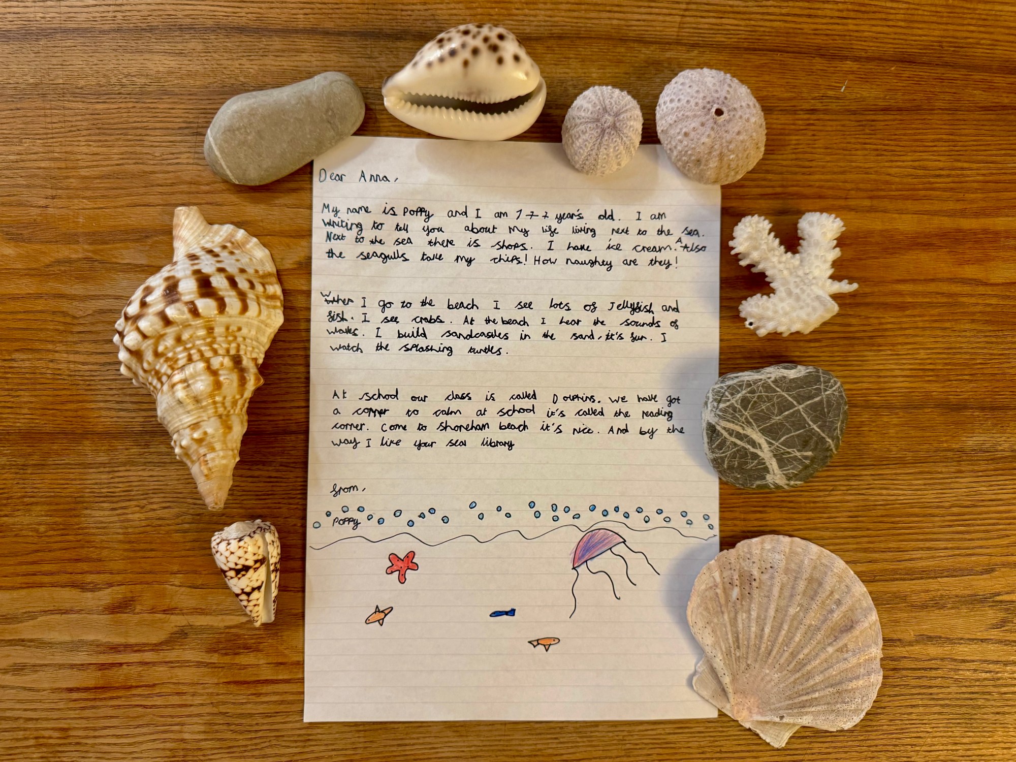 On November 19 I received 29 letters from Shoreham Beach Primary School in Shoreham, UK. A very special thanks goes to Jackie Verrall for spreading the word, and to the children’s teacher, Adam Joseph, for steering the ship of letters toward the Sea Library. (Check this out!)